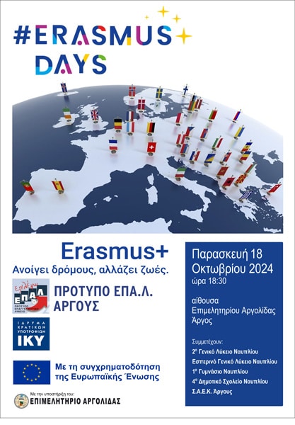 To Πρότυπο Επαγγελματικό Λύκειο Άργους διοργανώνει εκδήλωση #ErasmusDays την Παρασκευή 18 Οκτωβρίου και ώρα 18:30 στο Επιμελητήριο Αργολίδας.