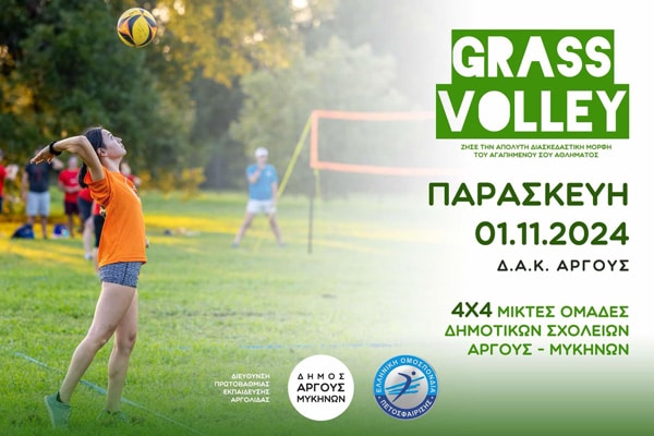 Το Grass Volley 4X4 θα διεξαχθεί στο ΔΑΚ Άργους και τελεί υπό τη συνδιοργάνωση της Ελληνικής Ομοσπονδίας Πετοσφαίρισης, του Δήμου Άργους – Μυκηνών και της Διεύθυνσης Πρωτοβάθμιας Εκπαίδευσης Αργολίδας. Κάθε Δημοτικό σχολείο μπορεί να συμμετέχει με 2 ομάδες για την Ε’ τάξη και 2 ομάδες για την ΣΤ’ τάξη.
