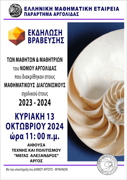 Το Παράρτημα Αργολίδας της Ελληνικής Μαθηματικής Εταιρείας διοργανώνει εκδήλωση βράβευσης των μαθητών και μαθητριών του Νομού Αργολίδας που διακρίθηκαν στους Πανελλήνιους Μαθηματικούς Διαγωνισμούς «Ευκλείδης», «Θαλής» «Πυθαγόρας», «Παιχνίδι και Μαθηματικά» καθώς και στον Τοπικό διαγωνισμό «Παλαμήδης» κατά το σχολικό έτος 2023 – 2024.