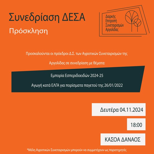 *Η ΔΙΑΡΚΗΣ ΕΠΙΤΡΟΠΗ ΣΥΝΕΤΑΙΡΙΣΜΩΝ ΑΡΓΟΛΙΔΑ (ΔΕΣΑ), δημιουργήθηκε στις 3 Οκτωβρίου 2023 με σκοπό να λειτουργεί ως κέντρο συντονισμού, ενημέρωσης, διαβούλευσης και συλλογικής εκπροσώπησης των αγροτικών συνεταιρισμών της Αργολίδας.