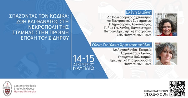 | Το Κέντρο Ελληνικών Σπουδών Ελλάδος ανακοινώνει την έναρξη υποβολής αιτήσεων στο νέο εργαστήριο «Σπάζοντας τον Κώδικα: Ερμηνεύοντας τη Ζωή και τον Θάνατο μέσα από Τάφους, Αγγεία και Διακοσμητικά Μοτίβα στην Πρώιμη Εποχή του Σιδήρου. Μελέτη περίπτωσης: Η Νεκρόπολη της Σταμνάς». Σε αυτό το εργαστήριο οι συμμετέχοντες θα έχουν την ευκαιρία να εμβαθύνουν στην πολιτιστική κληρονομιά της Πρώιμης Εποχής του Σιδήρου (Πρωτογεωμετρική και Γεωμετρική εποχή). Μέσα από μια σειρά θεματικών ενοτήτων, θα εξεταστούν οι τάφοι, τα ευρήματα και τα γεωμετρικά μοτίβα των αγγείων της εποχής έχοντας ως υπόθεση μελέτης ένα από τα πλουσιότερα αρχαία νεκροταφεία, στη Σταμνά Αιτωλίας, αναλύοντας πώς οι αρχαίοι χρησιμοποίησαν την τέχνη ως μέσο επικοινωνίας και συμβολισμού. Με τη βοήθεια ποιοτικών και ποσοτικών αναλύσεων, καθώς και σύγχρονων εργαλείων χαρτογραφίας (Γεωγραφικά Συστήματα Πληροφοριών – ΓΣΠ), θα έχουν την ευκαιρία να αποκωδικοποιήσουν τα κοινωνικά και πολιτισμικά μηνύματα που κρύβονται πίσω από τα ευρήματα, εμβαθύνοντας στην κατανόηση των δομών και των αξιών της εποχής. Το εργαστήριο θα συντονίσουν η Ελένη Σιμώνη, Δρ Πολεοδομικού Σχεδιασμού και Γεωγραφικών Συστημάτων Πληροφοριών, Αρχαιολόγος, Τμήμα Γεωλογίας, Πανεπιστήμιο Πατρών, Ερευνητική Υπότροφος CHS Harvard 2023-2024, και η Όλγα-Γιούλικα Χριστακοπούλου, Δρ Αρχαιολογίας, Εφορεία Αρχαιοτήτων Αχαΐας, Υπουργείο Πολιτισμού και Αθλητισμού, Ερευνητική Υπότροφος CHS Harvard 2023-2024. Το εργαστήριο θα διεξαχθεί 14 και 15 Δεκεμβρίου 2024, 11:00 πμ-3:00 μμ, στο ΚΕΣ στο Ναύπλιο, και είναι ανοικτό σε όλους/ες (περιορισμένος αριθμός θέσεων). Η επιλογή των συμμετεχόντων/ουσών θα γίνει από τις ακαδημαϊκές συντονίστριες του εργαστηρίου. Η προθεσμία υποβολής αιτήσεων είναι 17 Νοεμβρίου 2024. Για περισσότερες πληροφορίες και την ηλεκτρονική αίτηση συμμετοχής επισκεφθείτε την ιστοσελίδα του εργαστηρίου «Σπάζοντας τον Κώδικα: Ερμηνεύοντας τη Ζωή και τον Θάνατο». |