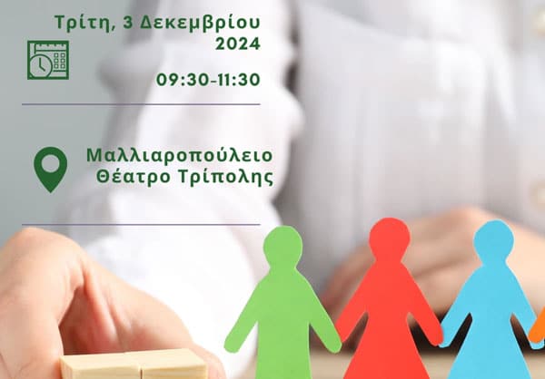 Εκδήλωση για την Παγκόσμια Ημέρα Ατόμων με Αναπηρία θα πραγματοποιηθεί την Τρίτη 3 Δεκεμβρίου και ώρα 9:30 στο Μαλλιαροπούλειο Θέατρο Τρίπολης.