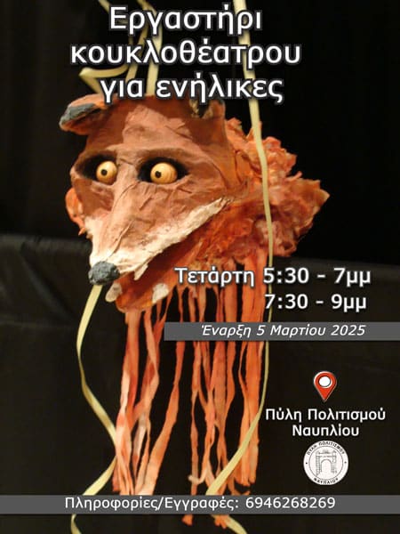Ένα νέο ταξίδι ξεκινά με το Εργαστήρι Κουκλοθέατρου για ενήλικες. Έναρξη: 5 Μαρτίου κάθε Τετάρτη: 5:30 – 7μμ και 7:30 – 9μμ στη Πύλη Πολιτισμού Ναυπλίου (Αχιλλέως Παράσχου 4)