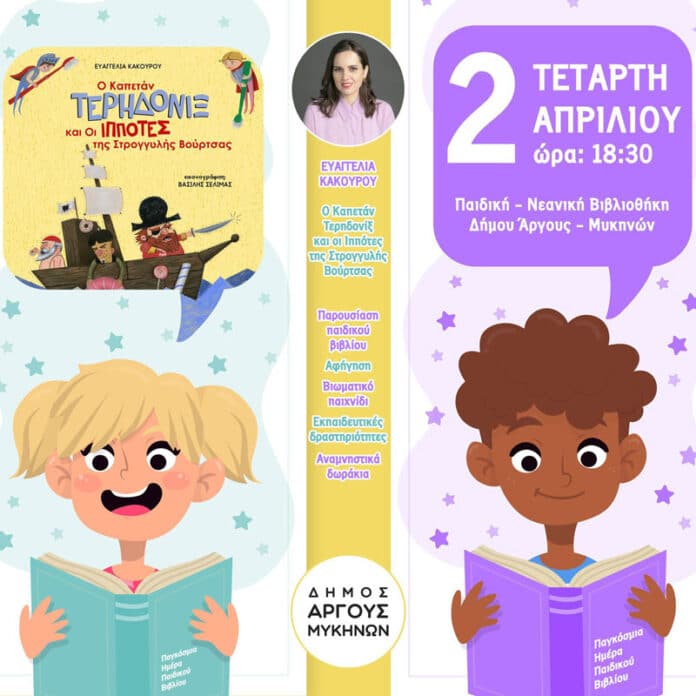 Με αφορμή την Παγκόσμια Ημέρα Παιδικού Βιβλίου, ο Δήμος Άργους – Μυκηνών φιλοξενεί τη συγγραφέα και δικηγόρο Ευαγγελία Κακούρου, για να παρουσιάσει το παιδικό βιβλίο της με τίτλο “Ο καπετάν ΤΕΡΗΔΟΝΙΞ και οι ΙΠΠΟΤΕΣ της Στρογγυλής Βούρτσας”.