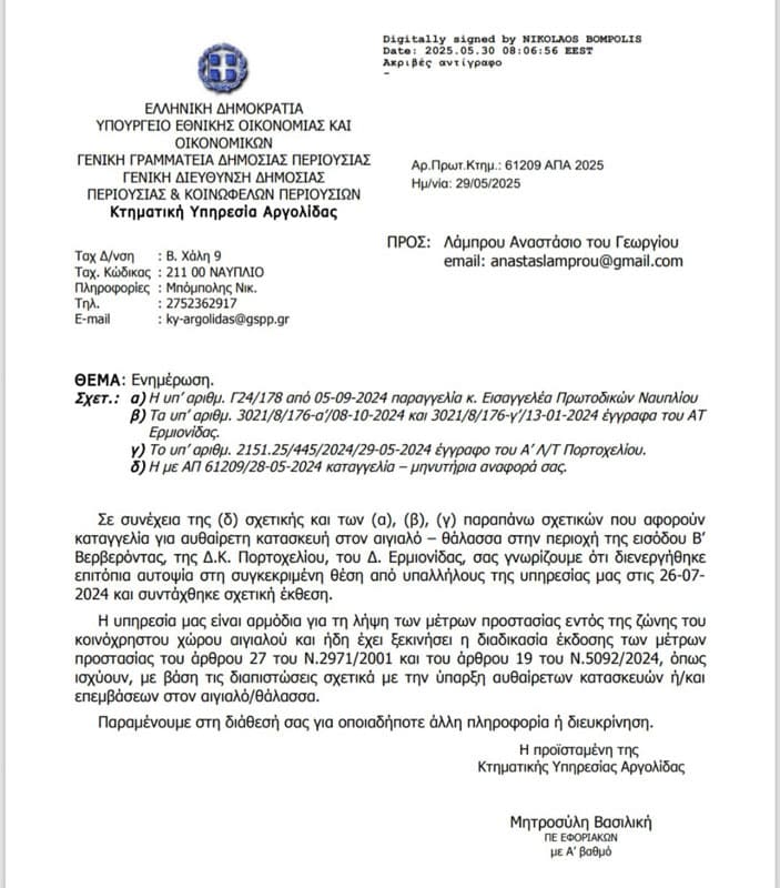 Η Απάντηση της κτηματικής Υπηρεσίας Αργολίδα επί των επίμαχων καταγγελιών μας από τον Μάιο του 2024 για τις αυθαιρεσίες επί αιγιαλού και παραλίας στην περιοχή της Βερβεροντας της Δ.Κ. Κρανιδίου του Δήμου Ερμιονίδας