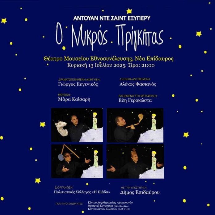 Ένα από τα πιο αγαπημένα και πολυμεταφρασμένα έργα της παγκόσμιας λογοτεχνίας, «Ο Μικρός Πρίγκιπας» του Αντουάν ντε Σαιντ-Εξυπερύ, είναι μια τρυφερή ιστορία που αποκαλύπτει βαθιές αλήθειες για τη φιλία, την αγάπη και το νόημα της ζωής. Η παράσταση θα πραγματοποιηθεί την Κυριακή 13 Ιουλίου και ώρα έναρξης: 21:00 στο Θέατρο Μουσείου Εθνοσυνέλευσης, Νέα Επίδαυρος