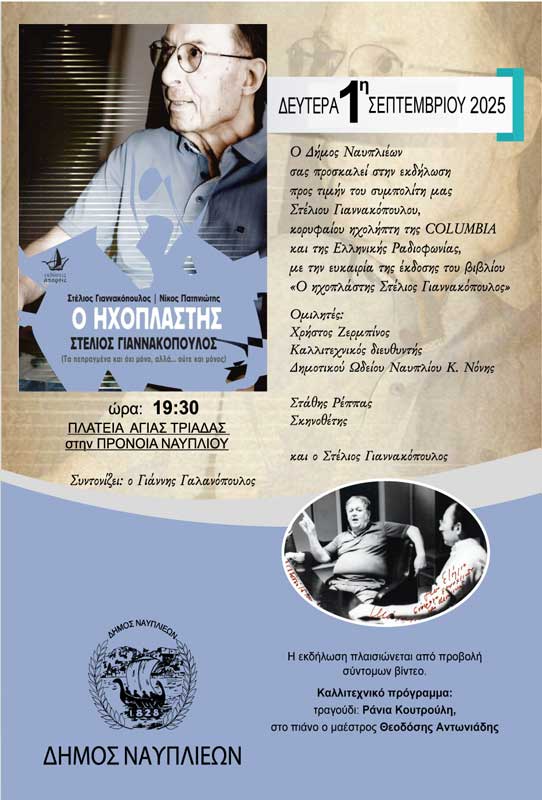 Ο Δήμος Ναυπλιέων θα τιμήσει τον συμπολίτη κ. Στέλιο Γιαννακόπουλο, κορυφαίο ηχολήπτη της Ελλάδας με τεράστια προσφορά και συμβολή στην ελληνική δισκογραφία, τη μουσική και τον πολιτισμό.