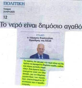 Ενώ ο πρωθυπουργός και ο πρόεδρος της ΚΕΔΕ κ. Λάζαρος Κυρίζογλου θεωρούν το νερό δημόσιο αγαθό, ο πρόεδρος της ΔΕΥΑ του Δήμου Ερμιονίδας έχει διαφορετική άποψη και το αποδεικνύει εμπράκτως. Διέκοψε την παροχή νερού σε πολύτεκνη οικογένεια, ημέρες καύσωνα, επειδή μέλος της οικογένειας αυτής του αντιμίλησε, και τότε εάν εθίγη να τον καταγγείλει στον Εισαγγελέα και όχι να του κόψει το νερό.