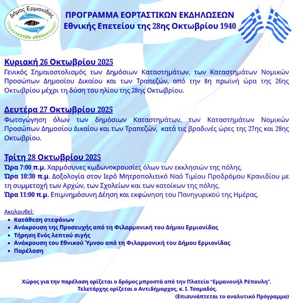 Αργολίδα Άργος: Οι εορταστικές εκδηλώσεις της 28ης Οκτωβρίου Από Ενημέρωση Πελοποννήσου 23 Οκτωβρίου 2025 FacebookTwitterViberWhatsApp Ακολουθήστε την Ενημέρωση Πελοποννήσου στο Facebook Αποκλειστικές Έρευνες – Συνεντεύξεις και ΆρθραΕιδήσεις από: Ναύπλιο – Άργος – Ερμιονίδα – Τρίπολη – Κορινθία – Αθλητικά – Γερανιός-2xalkidisfrontlabrou TagsΆργος ΑΞΙΖΕΙ ΝΑ ΔΙΑΒΑΣΕΤΕ Featured 2 ΕΛΤΑ Αργολίδας: Κενές απαντήσεις και καμία δέσμευση από το Υπουργείο 17 Απριλίου 2026 Featured 2 Τριήμερο Θεατροπαιδαγωγικών δράσεων στο Ναύπλιο 17 Απριλίου 2026 Featured 2 “Σεληνιακό τοπίο” ο δρόμος Τρίπολης – Στεμνίτσας 17 Απριλίου 2026 Featured 2 Υπεύθυνες οι υπηρεσίες της Περιφέρειας για τον κάμπο των Διδύμων 17 Απριλίου 2026 Αργολίδα Ημερίδα στο Ναύπλιο: Σεξουαλική Κακοποίηση Ατόμων με Αναπηρία 17 Απριλίου 2026 Ελλάδα “Επείγουσα ανάγκη για μέτρα ενίσχυσης των ΑμεΑ” 17 Απριλίου 2026 Αργολίδα ΚΚΕ: Μεγάλη Εκδήλωση στο Ναύπλιο για την Ακροναυπλία 16 Απριλίου 2026 Αργολίδα Ημερίδα Επιμελητηρίου Αργολίδας: “Παράγουμε στην Ελλάδα” 16 Απριλίου 2026 Αργολίδα Γονίδια και Επιλογές: Εκδήλωση του ΚΕΣ στο Ναύπλιο για τη Γενετική 16 Απριλίου 2026 Τελευταίες ειδήσεις Αργολίδα Ημερίδα στο Ναύπλιο: Σεξουαλική Κακοποίηση Ατόμων με Αναπηρία 17 Απριλίου 2026 Ελλάδα “Επείγουσα ανάγκη για μέτρα ενίσχυσης των ΑμεΑ” 17 Απριλίου 2026 Αργολίδα ΚΚΕ: Μεγάλη Εκδήλωση στο Ναύπλιο για την Ακροναυπλία 16 Απριλίου 2026 Αργολίδα Ημερίδα Επιμελητηρίου Αργολίδας: “Παράγουμε στην Ελλάδα” 16 Απριλίου 2026 Αργολίδα Γονίδια και Επιλογές: Εκδήλωση του ΚΕΣ στο Ναύπλιο για τη Γενετική 16 Απριλίου 2026 Περιφέρεια 14 συλλήψεις σε Αργολίδα, Κορινθία & Λακωνία 16 Απριλίου 2026 Περιφέρεια Σοκαριστικά ευρήματα στον Πάρνωνα: 95 δηλητηριασμένα δολώματα και ένας νεκρός σκύλος 16 Απριλίου 2026 Αθλητισμός Ο παλμός του μπάσκετ χτυπά δυνατά στην Τρίπολη 16 Απριλίου 2026 Τα πιο δημοφιλη Υπεύθυνες οι υπηρεσίες της Περιφέρειας για τον κάμπο των Διδύμων Featured 2 17 Απριλίου 2026 Έλενα Χαραμή: Η λαϊκοδημοτική φωνή της Πελοποννήσου Συνεντεύξεις 17 Φεβρουαρίου 2025 Ολόθερμες… ευχές Δημάρχου Αργολίδα 12 Απριλίου 2026 “Λέμε την Αλήθεια στην Εξουσία” – 14ο Σεμινάριο Ελλάδα 4 Απριλίου 2026 Κ.Υ. Κρανιδίου: Πώς εκτοξεύτηκε το κόστος κατά 1 εκατομμύριο ευρώ; Αργολίδα 15 Απριλίου 2026 Αρχική σελίδα