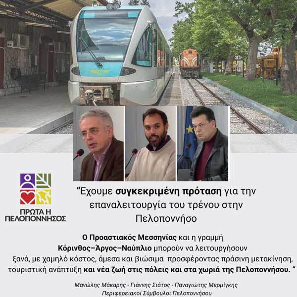 Η παράταξή «Πρώτα η Πελοπόννησος» θεωρεί ότι η αναβίωση του Πελοποννησιακού Σιδηροδρόμου δεν αποτελεί έργο νοσταλγίας, αλλά στρατηγική επιλογή για την πράσινη ανάπτυξη, την περιφερειακή συνοχή, τον πολιτισμό και την τουριστική βιωσιμότητα.