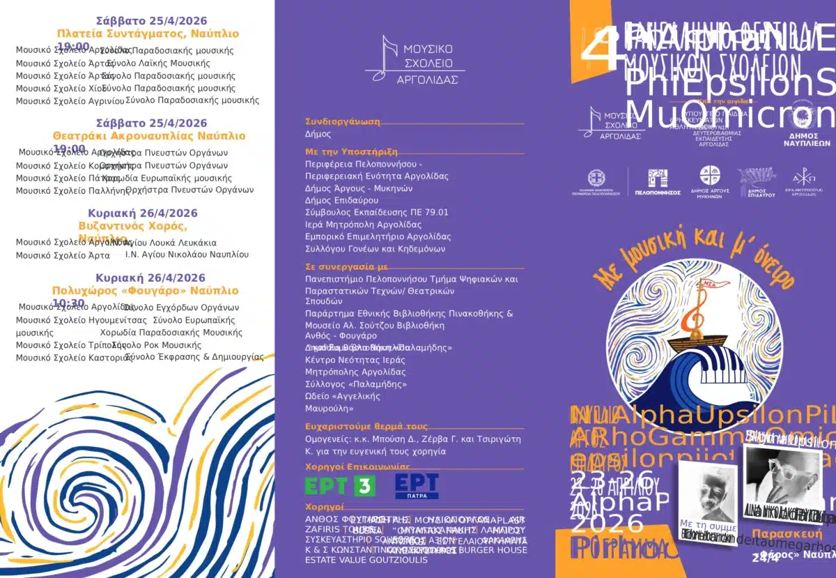 Ο Δήμος Ναυπλιέων ανακοινώνει με ιδιαίτερη χαρά τη διοργάνωση του 4ου Πανελλήνιου Φεστιβάλ Μουσικών Σχολείων με τίτλο «Με μουσική και όνειρο», το οποίο θα πραγματοποιηθεί από τις 23 έως τις 26 Απριλίου 2026.